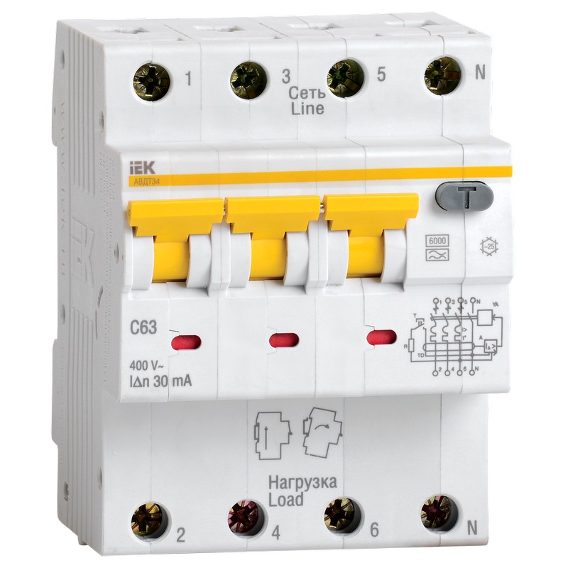 - Номинальный условный ток короткого замыкания 6000А позволяет устанавливать автоматические выключатели дифференциального тока АВДТ34 в качестве вводных автоматов защиты.