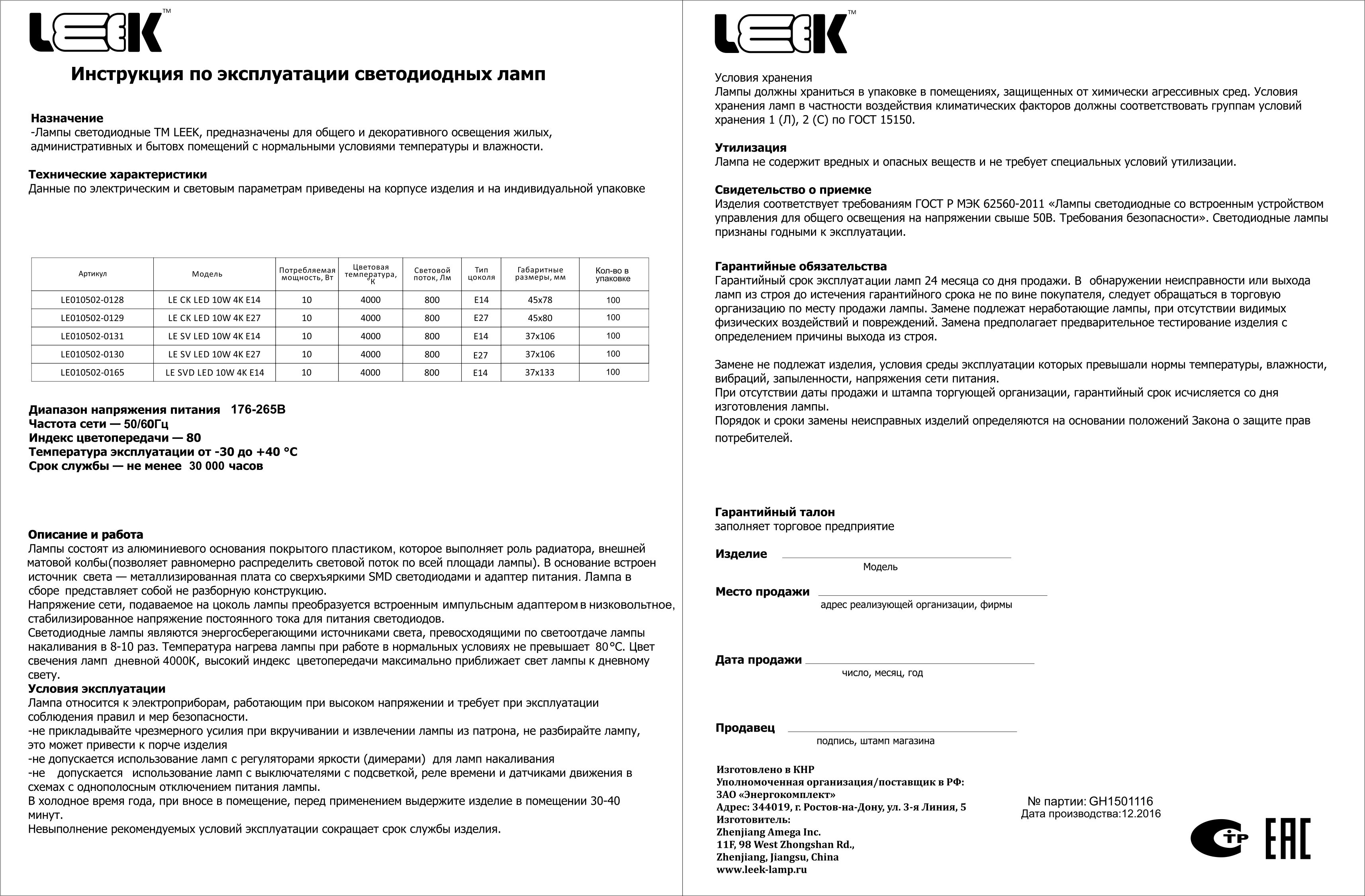 Срок службы светодиодов: 30000ч.