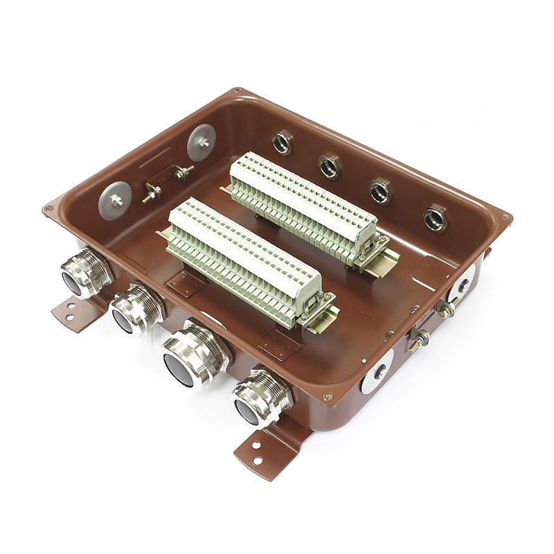 Узлы заземления не окрашены и не требуют зачистки. DIN - рейка позволяющая установить дополнительное оборудование. Винты под крест-плоскую отвертку. Оцинкованная сталь с грунтовым покрытием. Коробки КЗНС-32 и КЗНС-48, с наборными зажимами предназначены для соединения и разветвления силовых электрических цепей и цепей КИПиА, выполняемых контрольными и силовыми кабелями с алюминиевыми или медными жилами. Коробки комплектуются латунными либо пластиковыми кабельными вводами. Степень защиты коробок с латунными кабельными вводами и металлическими заглушками IP65 по ГОСТ 14254-2015. С пластиковыми кабельными вводами IP54 по ГОСТ 14254-2015. Коробка распределительная металлическая на наружной поверхности имеет ушки, предназначенные для их крепления к строительным конструкциям с помощью стандартных крепежных изделий или сварки. Коробки клеммные КЗНС-32 и КЗНС-48 комплектуются металлическими и пластиковыми кабельными вводами. Имеют 4 дополнительных отверстия ?25мм для установки кабельных вводов (привертных сальников), Отверстия закрыты металлическими заглушками, которые при необходимости снимают. Коробка КЗНС-32 и коробка КЗНС-48 имеют одинаковый корпус, отличием коробок является только количество предустановленных в них клеммных зажимов. Зажимы устанавливаются на DIN рейку. Коробки клеммные — это универсальное решение для соединения силовых и контрольных кабелей с возможностью размещения дополнительных элементов на DIN-рейку таких как: Распределительных блоков РБД, клеммных зажимов до 80А, блоков шин в корпусе, разнообразных шин на изоляторе.