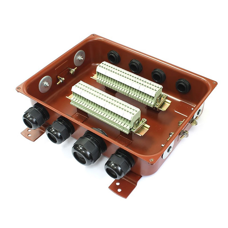 Узлы заземления не окрашены и не требуют зачистки. DIN - рейка позволяющая установить дополнительное оборудование. Винты под крест-плоскую отвертку. Оцинкованная сталь с грунтовым покрытием. Коробки КЗНС-32 и КЗНС-48, с наборными зажимами предназначены для соединения и разветвления силовых электрических цепей и цепей КИПиА, выполняемых контрольными и силовыми кабелями с алюминиевыми или медными жилами. Коробки комплектуются латунными либо пластиковыми кабельными вводами. Степень защиты коробок с латунными кабельными вводами и металлическими заглушками IP65 по ГОСТ 14254-2015. С пластиковыми кабельными вводами IP54 по ГОСТ 14254-2015. Коробка распределительная металлическая на наружной поверхности имеет ушки, предназначенные для их крепления к строительным конструкциям с помощью стандартных крепежных изделий или сварки. Коробки клеммные КЗНС-32 и КЗНС-48 комплектуются металлическими и пластиковыми кабельными вводами. Имеют 4 дополнительных отверстия ?25мм для установки кабельных вводов (привертных сальников), Отверстия закрыты металлическими заглушками, которые при необходимости снимают. Коробка КЗНС-32 и коробка КЗНС-48 имеют одинаковый корпус, отличием коробок является только количество предустановленных в них клеммных зажимов. Зажимы устанавливаются на DIN рейку. Коробки клеммные — это универсальное решение для соединения силовых и контрольных кабелей с возможностью размещения дополнительных элементов на DIN-рейку таких как: Распределительных блоков РБД, клеммных зажимов до 80А, блоков шин в корпусе, разнообразных шин на изоляторе.