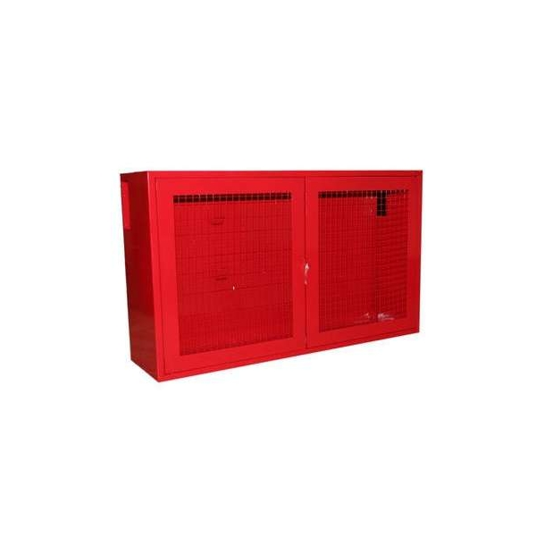 Пожарный металлический закрытый двухдверный щит с сеткой.