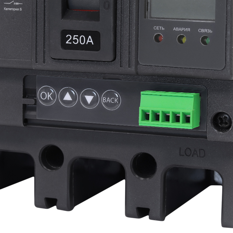 Ключевые особенности: электронный расцепитель, ЖК-дисплей, защита от перегрузки и КЗ, функция защиты от перенапряжения и обрыва фаз.