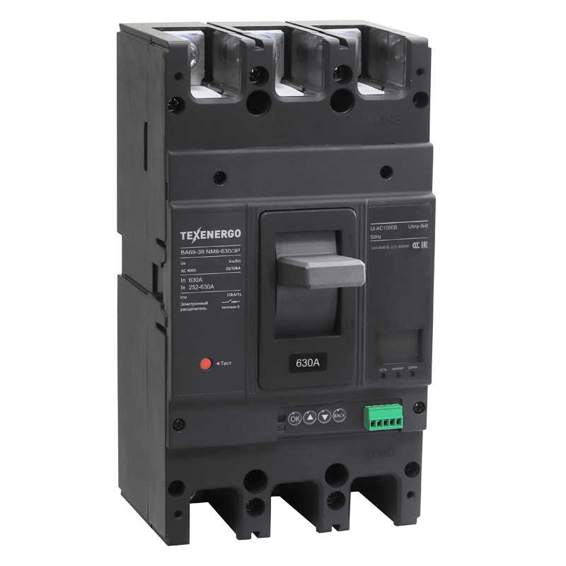 Современный автоматический выключатель серии ВА69 NM8 с электронным расцепителем и встроенным ЖК-дисплеем. Предназначен для защиты распределительных сетей и электрооборудования переменного тока частотой 50 Гц напряжением до 400 В и током до 1250 А. Обеспечивает комплексную защиту линий от перегрузок, коротких замыканий, перенапряжений, пониженного напряжения и обрыва фазы. Удобный ЖК-дисплей позволяет контролировать параметры сети и настройки защиты. Выключатель подходит для нечастых коммутаций цепей и пусков электродвигателей.