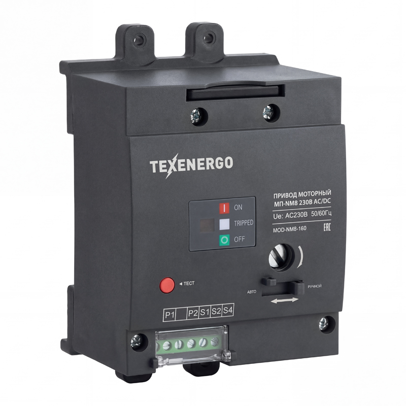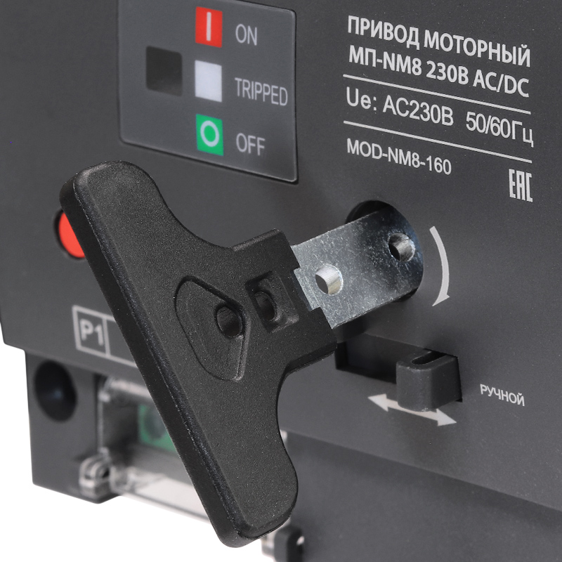 Привод моторный — устройство для дистанционного управления автоматическим выключателем в литом корпусе. Позволяет включать и отключать выключатель по сигналу с кнопки, контроллера или системы автоматики без присутствия оператора у щита.